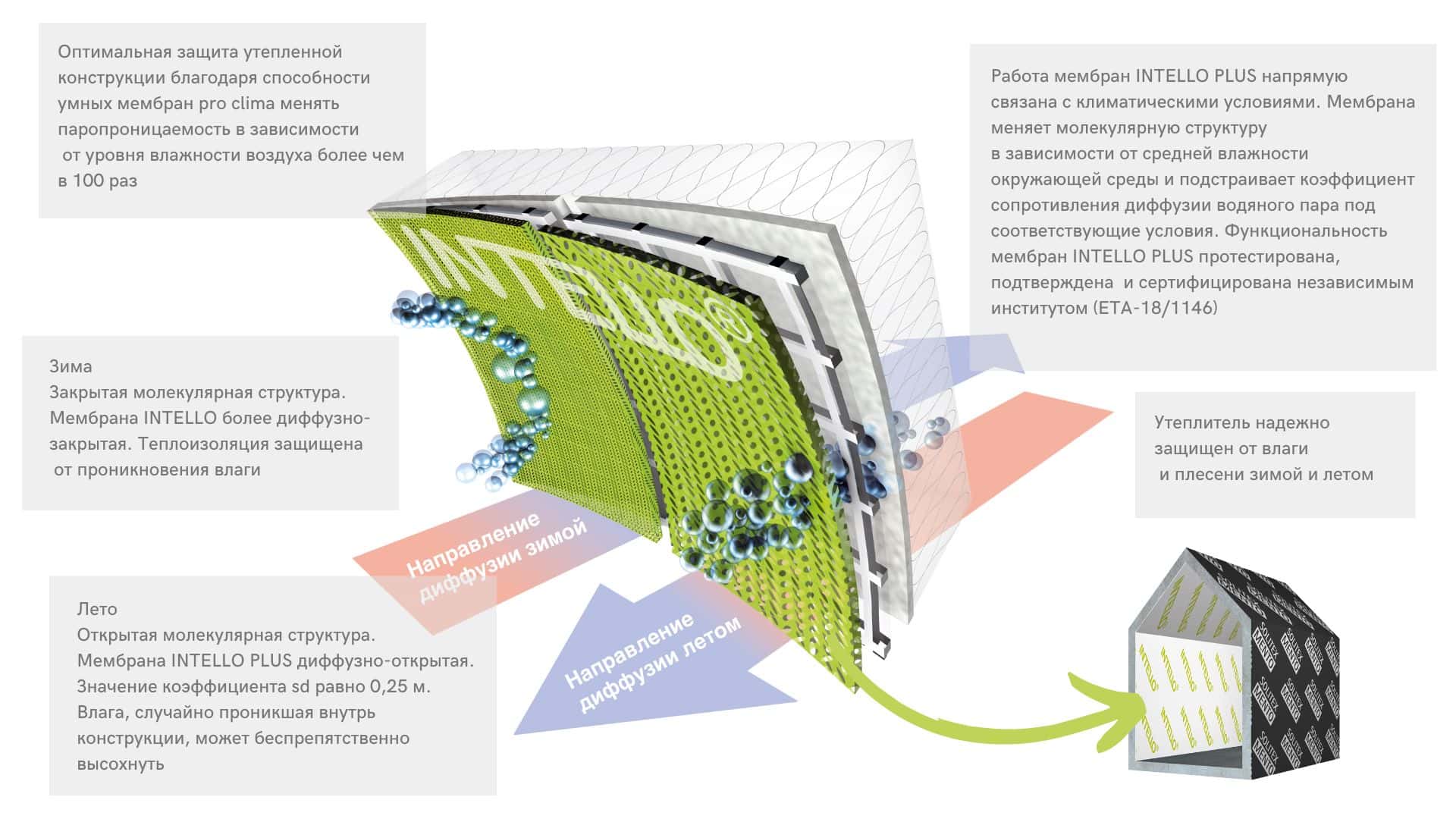- использовать в качестве пароизоляции мембрану с вариативным sd, которая летом становится максимально диффузно-открытой и может дать конструкции высохнуть, например pro clima INTELLO